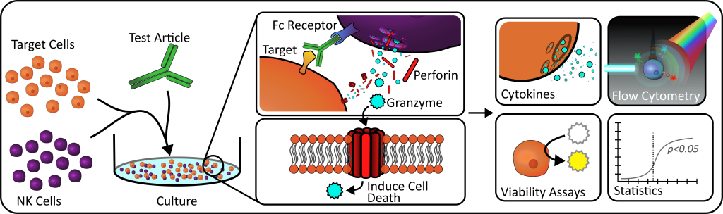 Principle: Effector cells (NK Cells) are cultured with Target Cells (cancer) in the presence of a therapeutic antibody (Test Article) to induce ADCC. Observed endpoints for ADCC include phenotyping of effector cells with activation and degranulation markers, cytokine production and cell damage (lactate dehydrogenase) or cell death.