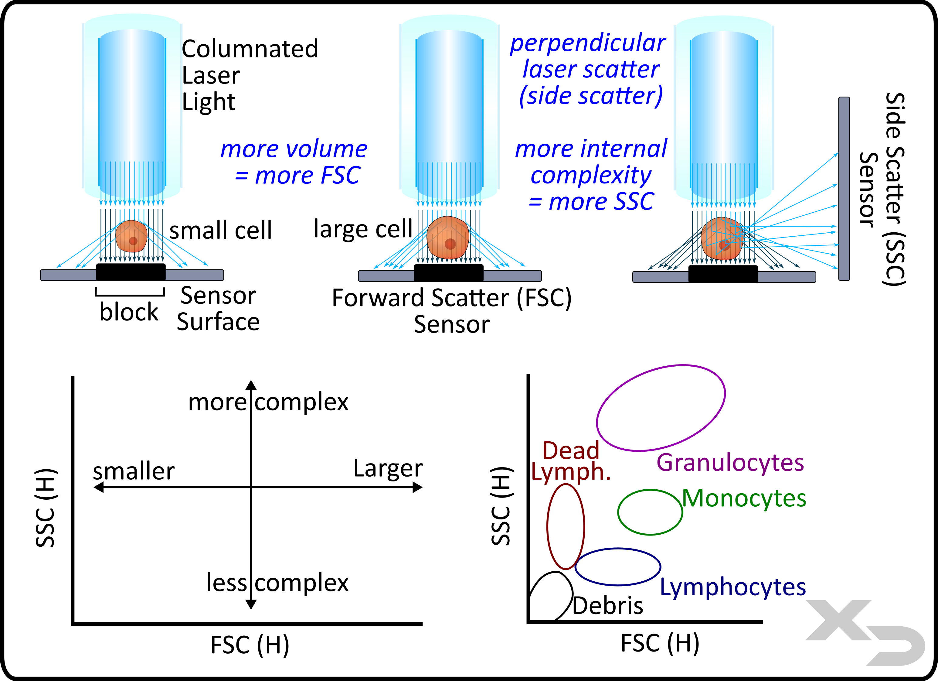 Figure: Illustration of forward scatter (FSC) and side scatter (SSC) light collection and how it relates to cell size and complexity respectively.