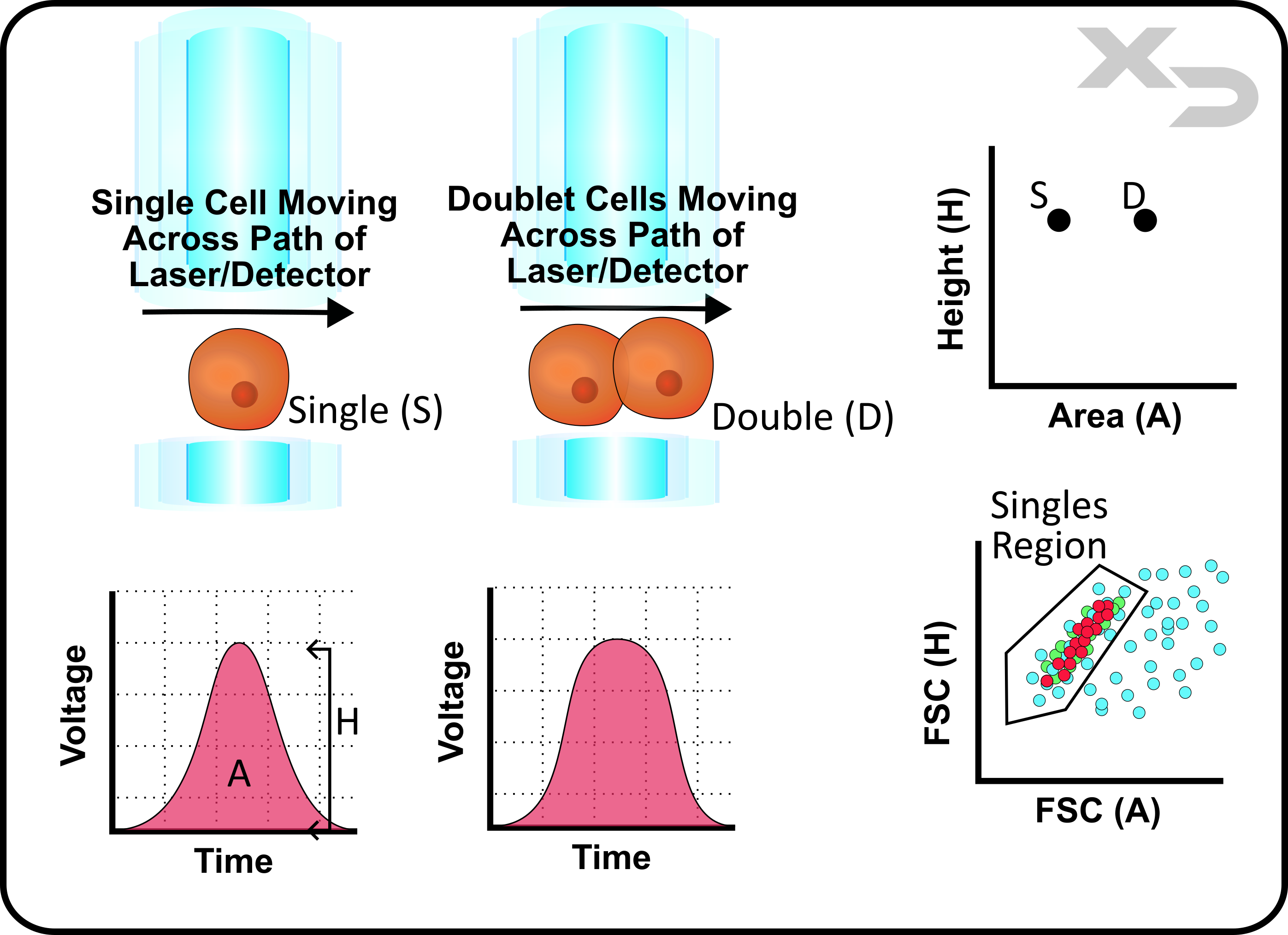 Doublet discrimination can be achieved using the forward scatter (FSC) perameter as it is a reflection of cellular size. As discussed in the sections above, the voltage/time curve for any cellular event can be analyzed by either height (H) or integrated area (A). When a doublet cell passes by the laser, the measured voltage height does not change nearly as much as the witdth (time) that it takes to pass the laser. Thus if the ratio of A/H is calculated, doublets will always tend to have a much higher ratio; ideally independent of cell size.