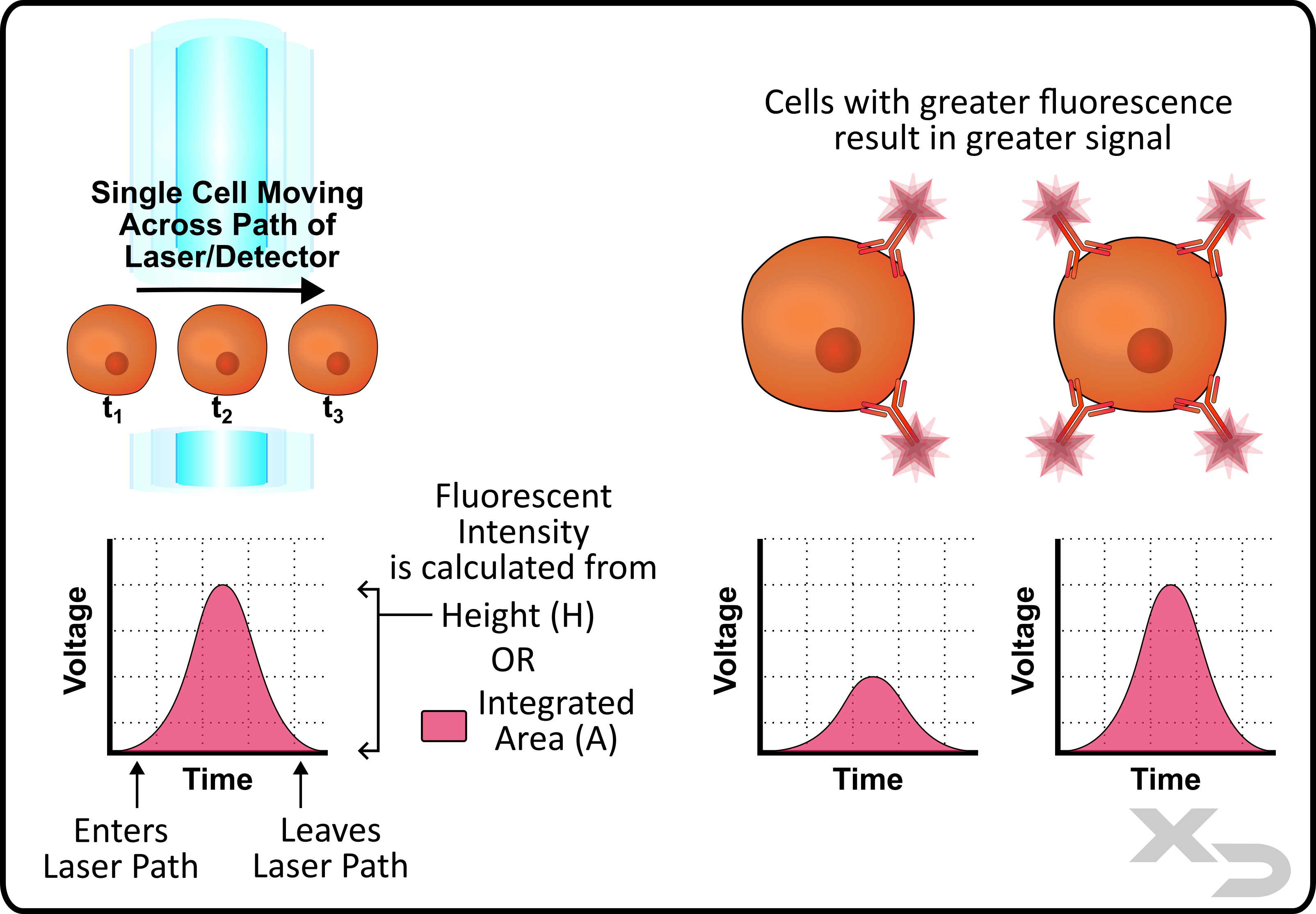 As a single cell moves across the path of the laser it fluoresces. The emitted fluorescence is detected by the PMTs which produces an analog voltage signal. After the signal passes through an analog to digital converter (ADC) the voltage signal can then be interpreted. As depicted in the figure below, the detected fluorescence, and thus voltage signal, is minimal when the cell first enters the laser’s path. Then as the cell is fully illuminated by the laser it gives off the most intense signal, which then dims as the cell moves out of the laser’s path.